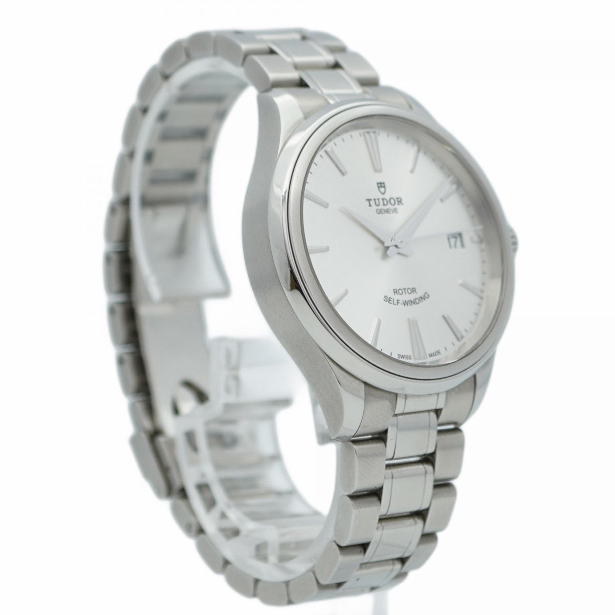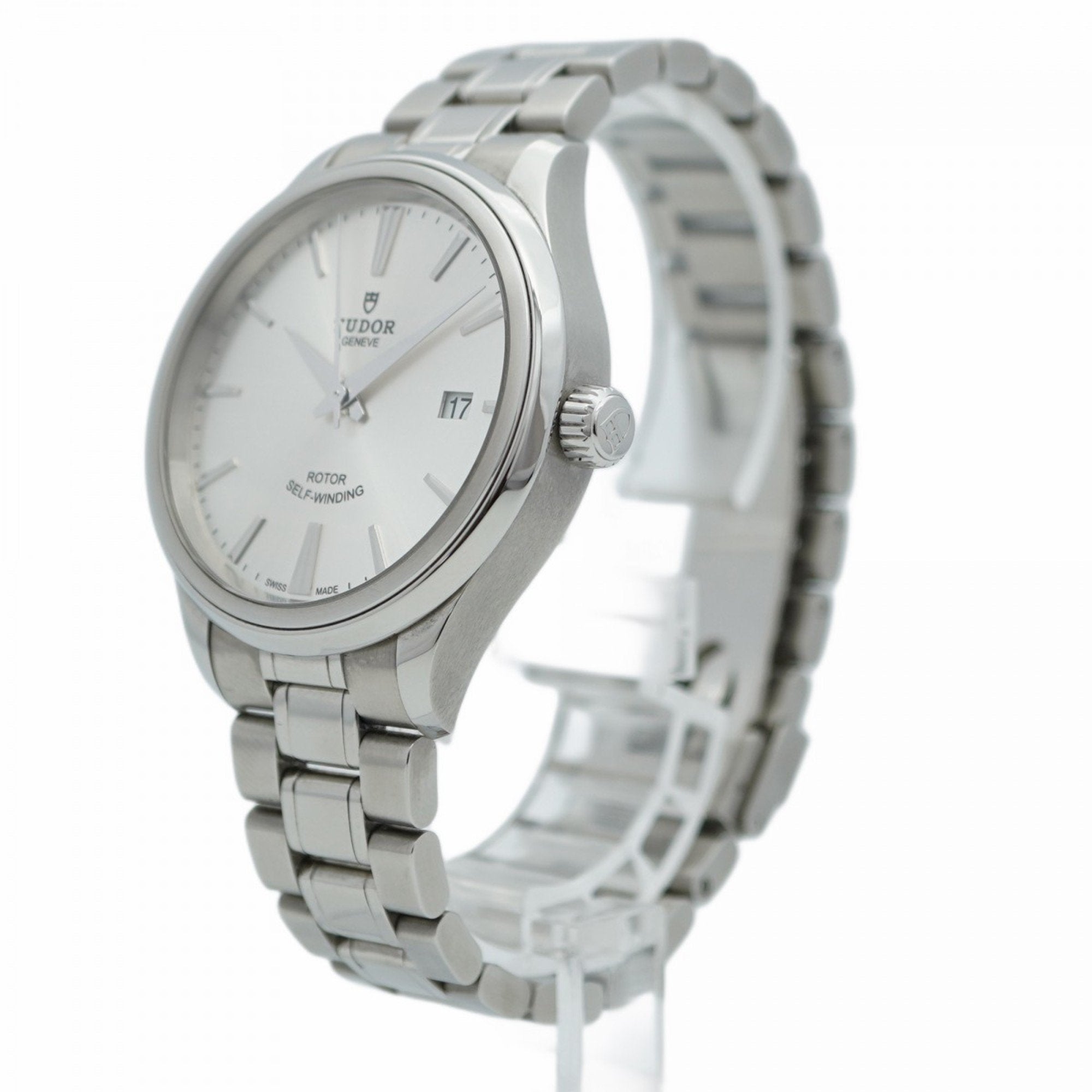 The Tudor Style 12500 brings understated refinement to the wrist, blending Swiss automatic precision with a clean, versatile design. Its 39 mm stainless steel case and polished bezel frame a crisp silver dial, offering a timeless aesthetic suited for both formal and casual occasions.